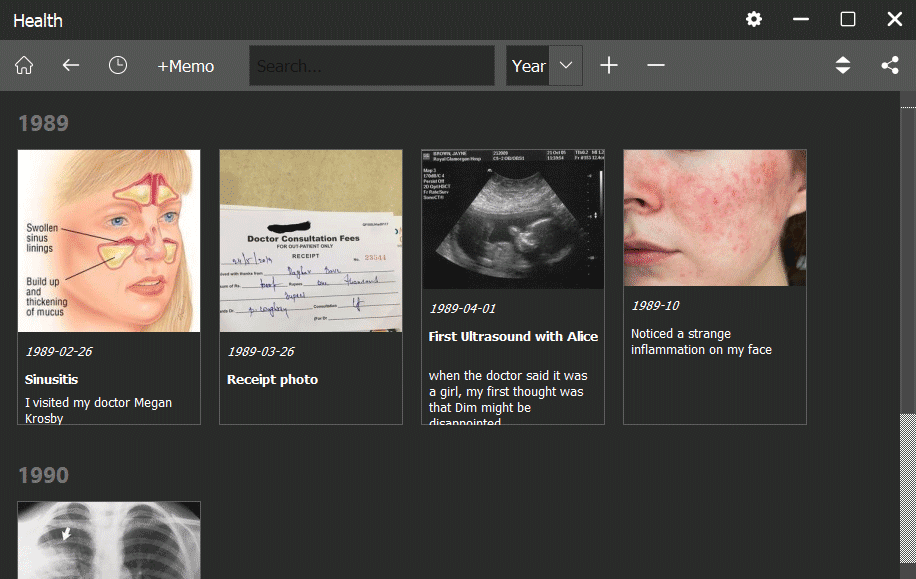 Health is the most precious thing in our life, so when something happens to our health, it greatly impacts events and sometimes dramatically changes our lifestory. So health incidents are an important and integral part of history, and one way or another, you will be adding health records to Memo app.