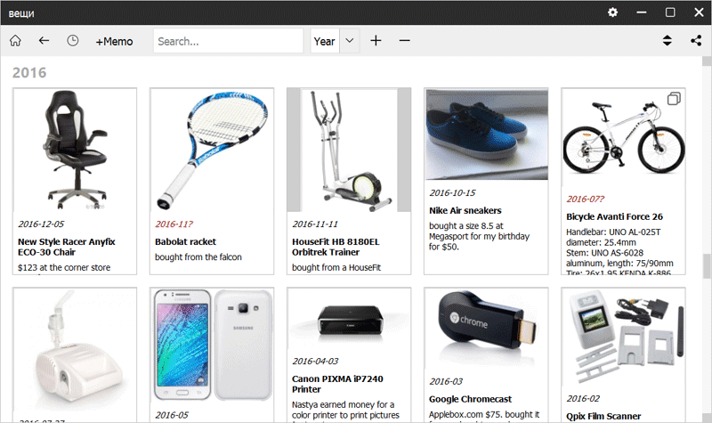 Our stuff (smartphones, appliances, clothes, cars, tools, etc.) are a part of our lives. These things are memories in themselves and they can also help you recall various events associated with them. That's why it's important to add them to the Memo app (and we've created a default tag for this).