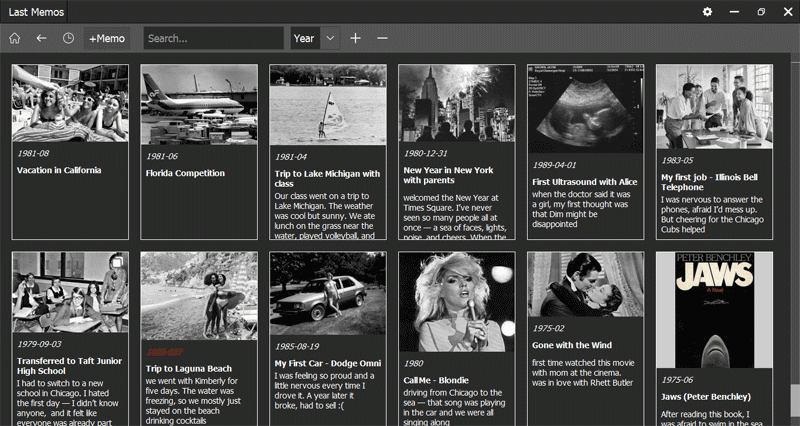 It's Memo app - the most appropriate tool for writing autobiography. This program gives you complete freedom (like Notepad), but at the same time automatically maintains order, forming the correct mosaic. You can add memories in any order. You can add a photo to a memory or not. You can add a title, or you can do without it. You can add a date with any accuracy. If you don't remember - add only the year and a question mark. Such memories with a question mark - stand out in the mosaic, so you will not forget about them and someday find out a more accurate date.